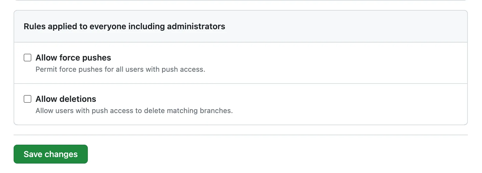 브랜치 보호 규칙을 생성하게 되면, 강제 푸쉬와 브랜치 삭제는 기본으로 disabled로 설정돼요.