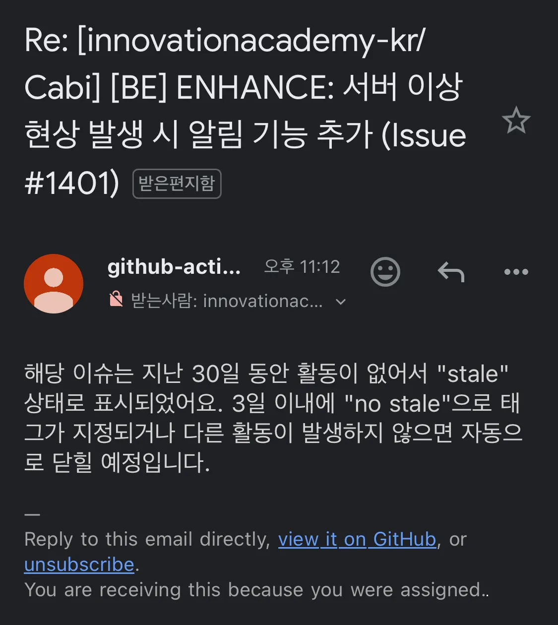 까비는 이슈나 PR 관련해서 이벤트가 발생하면 자동으로 디스코드로 알림이 가도록 설정되어 있기 때문에 팀원들도 쉽게 비활성 여부를 파악할 수 있을 것이라고 생각해요.