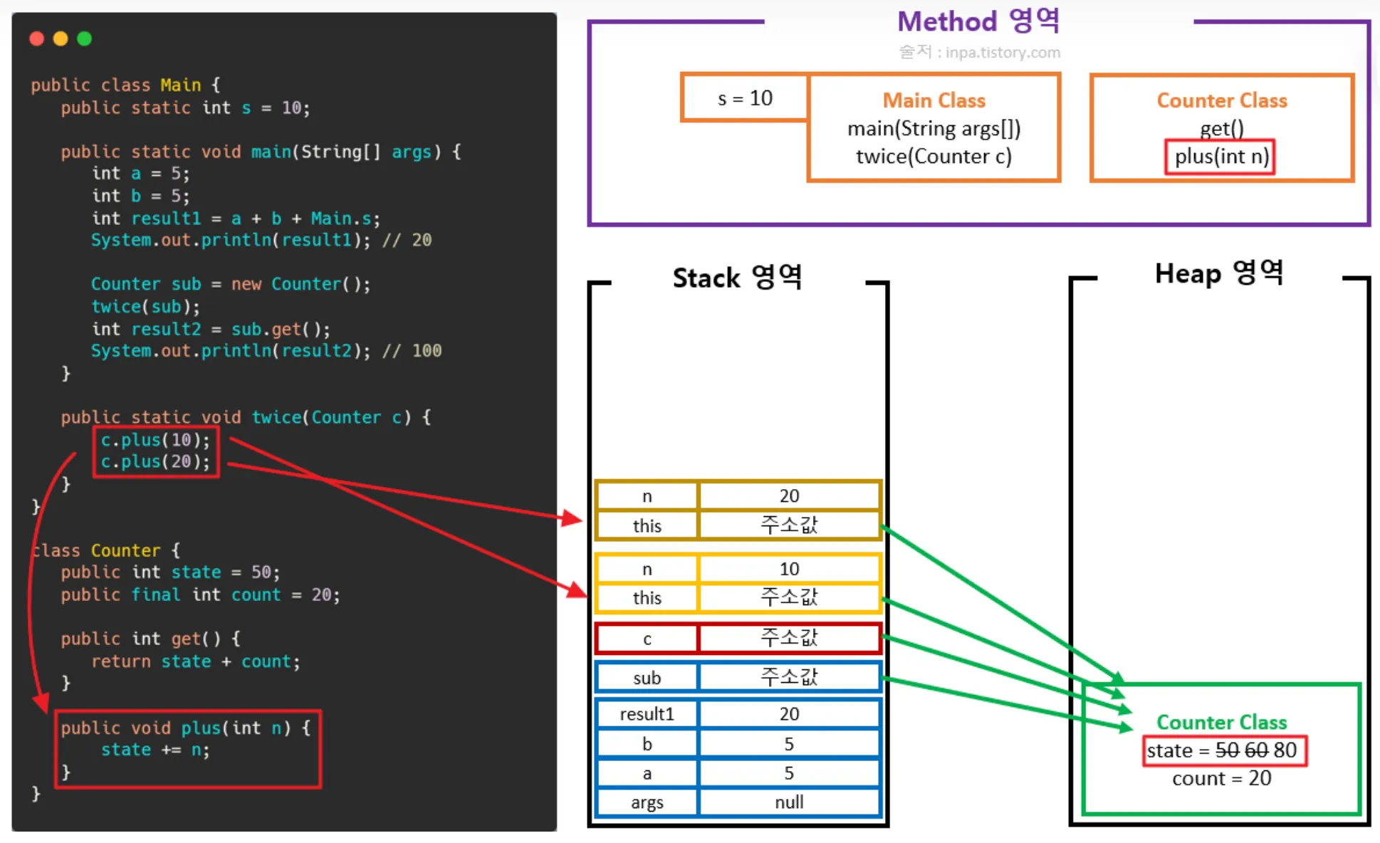 plus 메서드 실행으로 각각 스택 프레임 생성 및 참조 주소를 통해 힙 영역의 데이터 변경