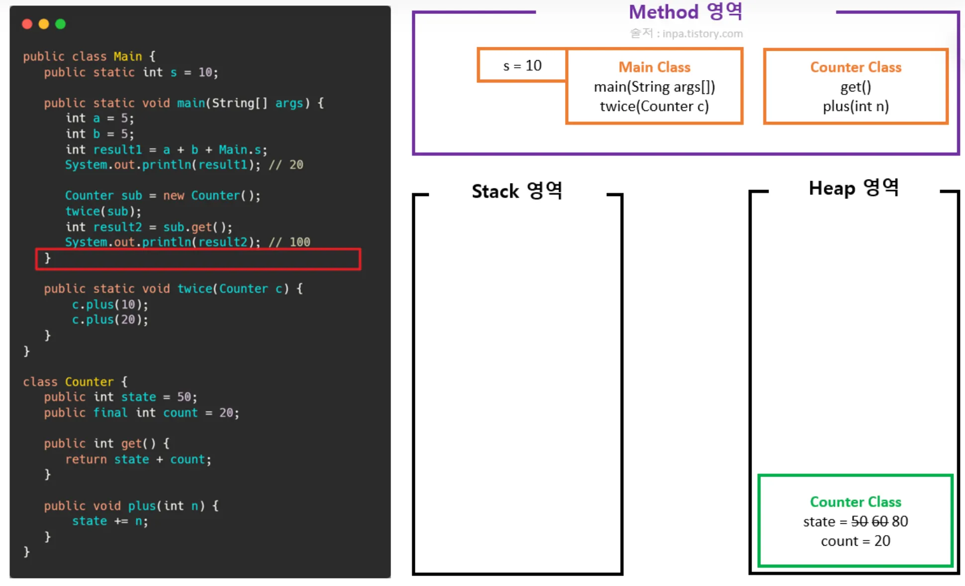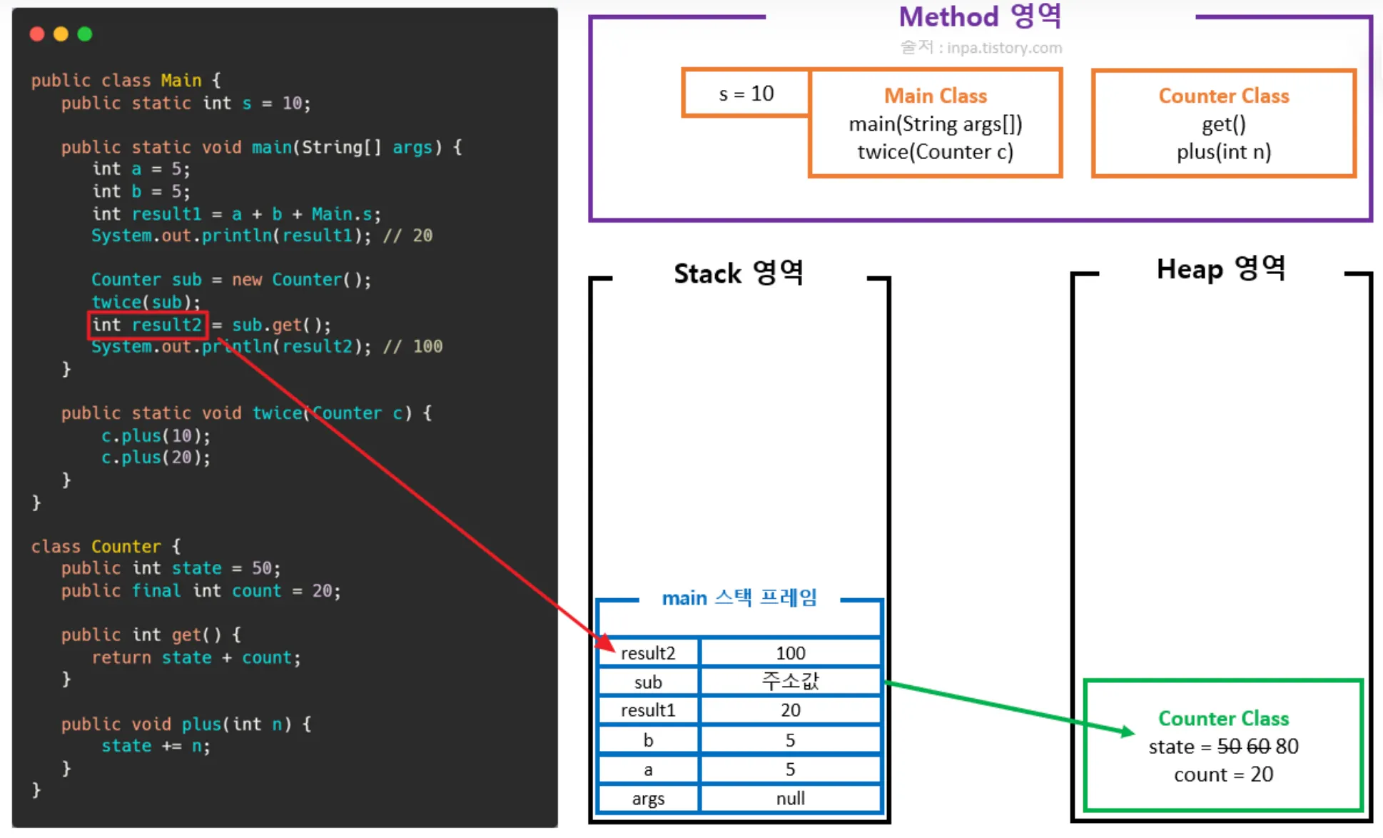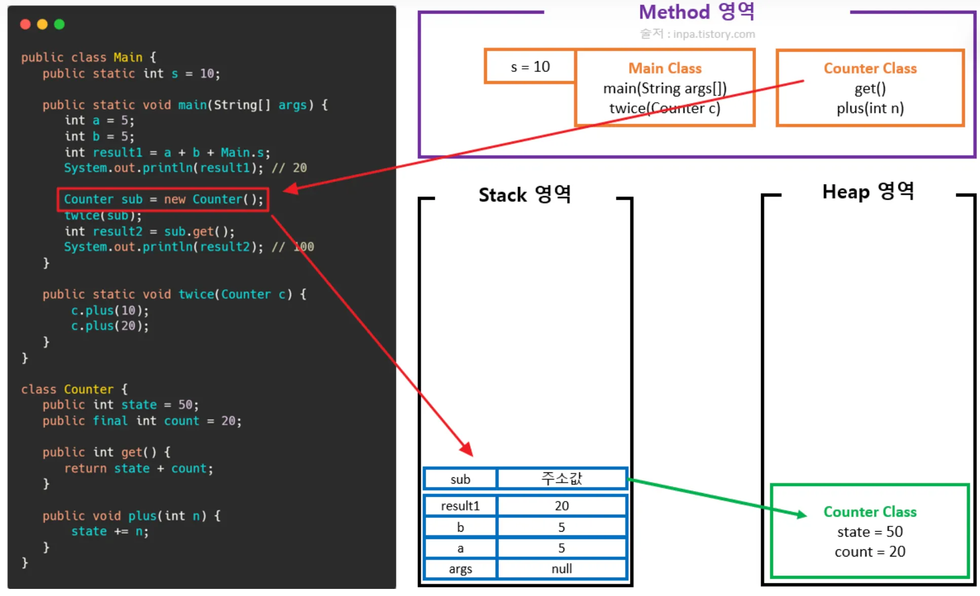 Counter 클래스의 객체(인스턴스) 생성(힙 영역에 할당, 저장 후 스택 영역에 메모리 주소 참조)