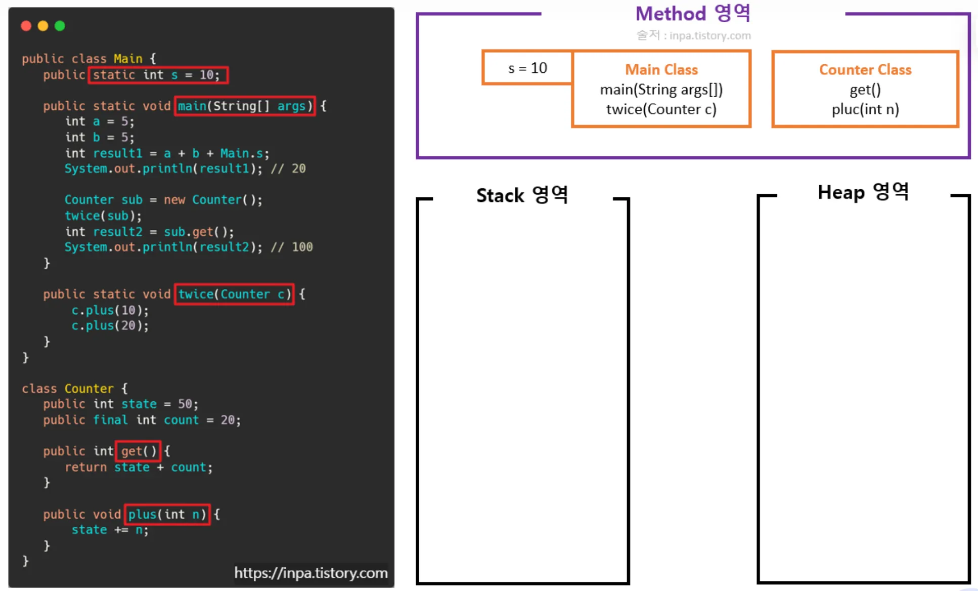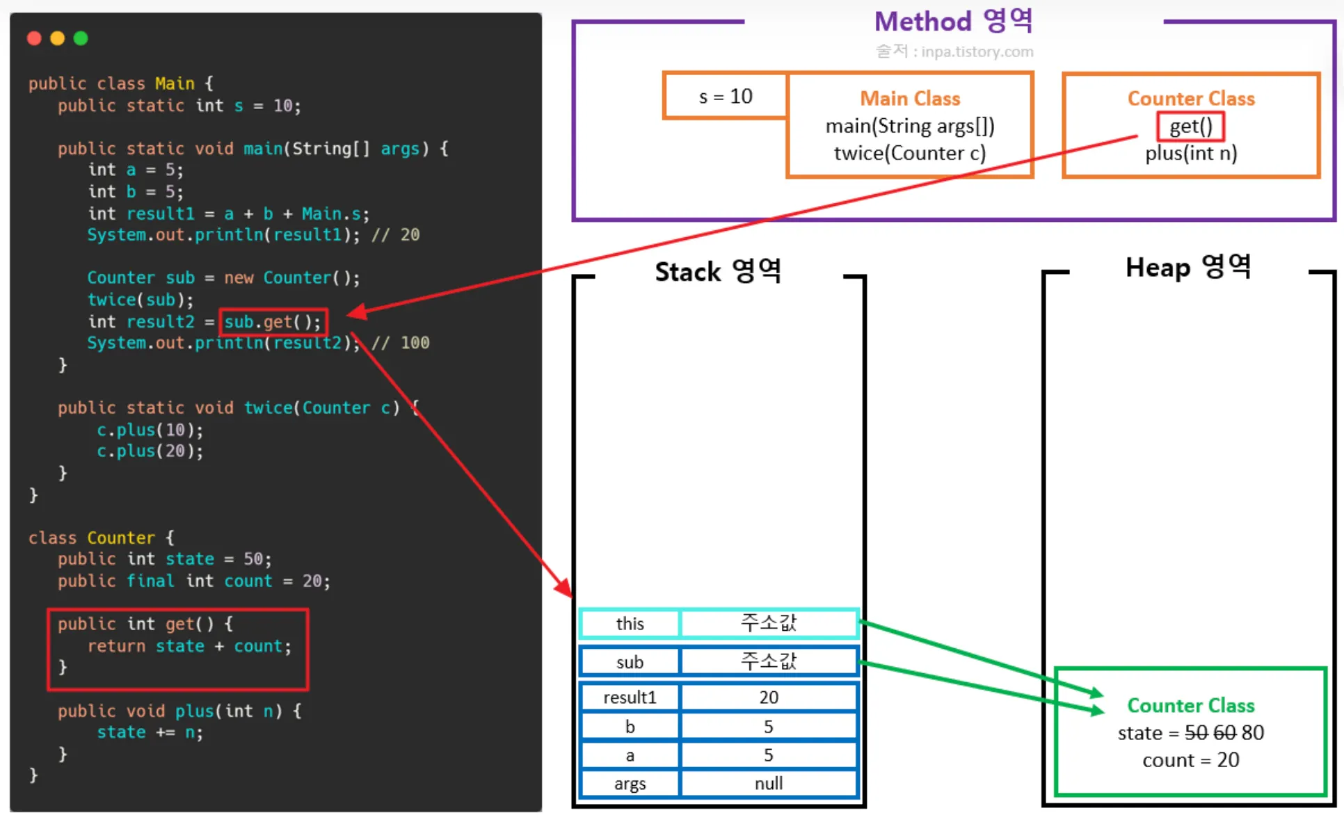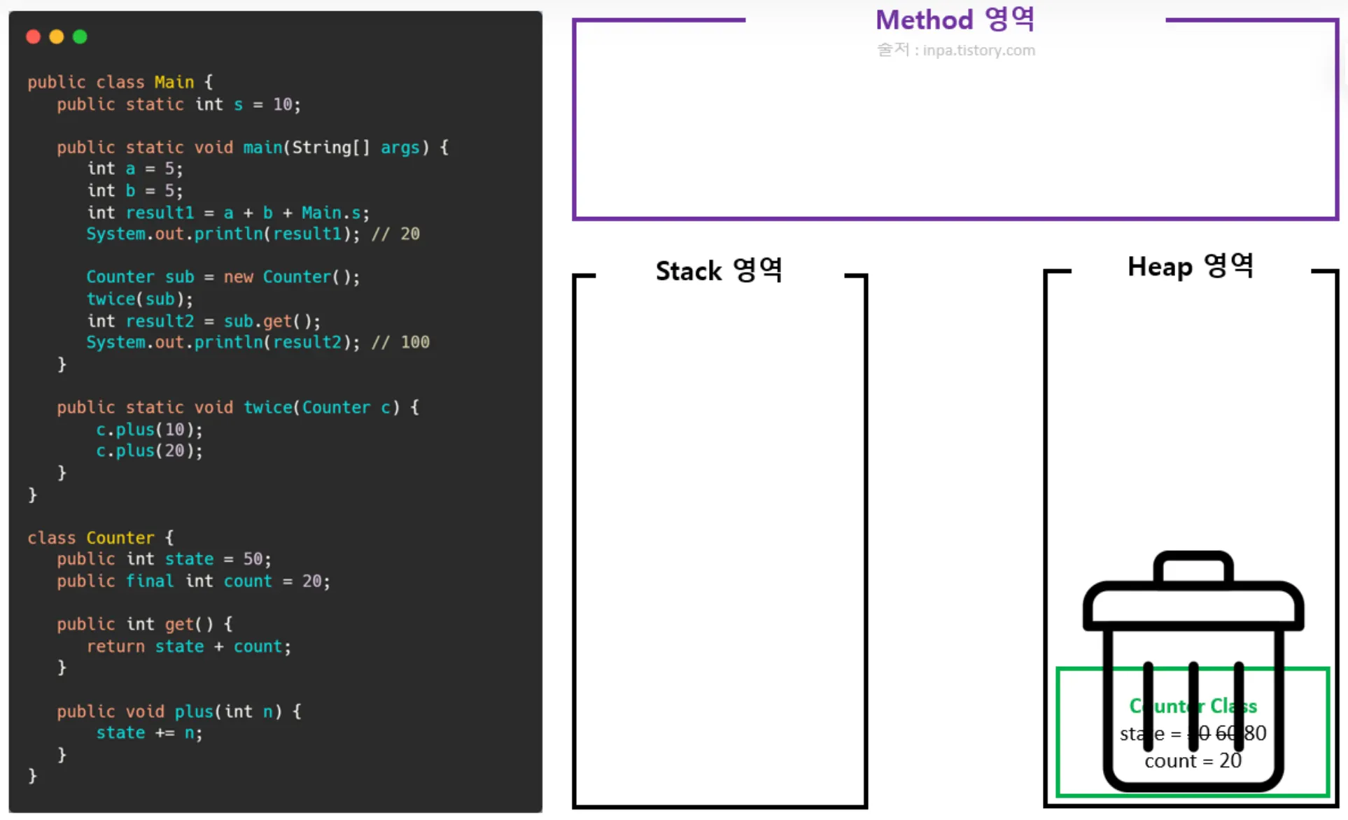 Counter 클래스의 객체(인스턴스) 생성(힙 영역에 할당, 저장 후 스택 영역에 메모리 주소 참조)