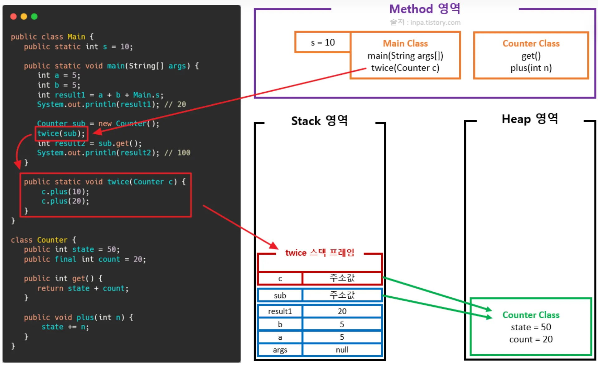twice 메서드 수행 시 스택 영역에 스택 프레임 생성 및 매개변수 저장