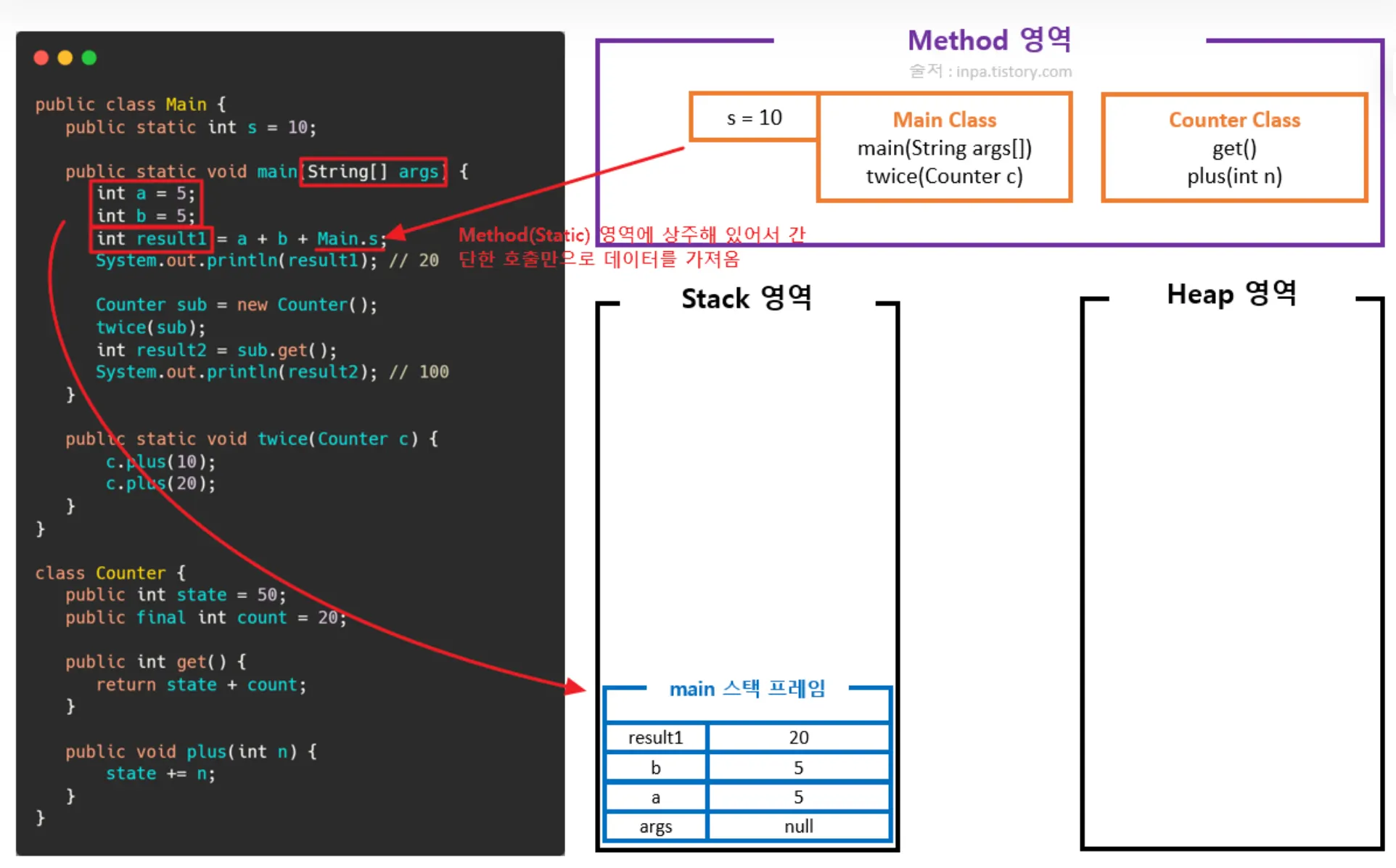 Method 영역은 어디서나 접근 가능하고, Mehtod 영역의 데이터는 프로그램의 시작부터 종료까지 메모리에 남아있는다.