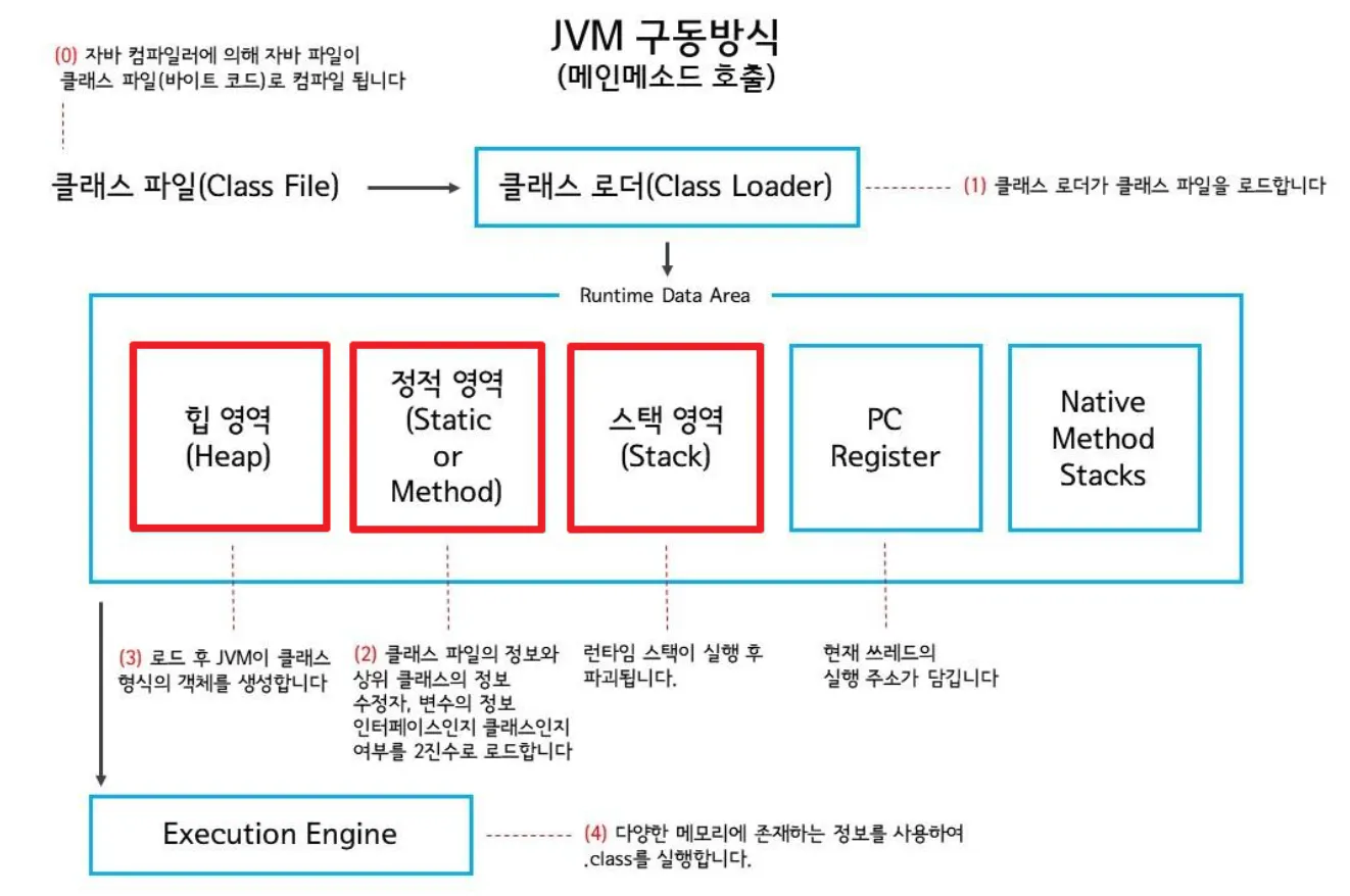 JVM의 메모리 공간(Runtime Data Area)은 크기 Method(Static) 영역, Stack 영역, Heap 영역으로 구분되고, 데이터 타입(자료형)에 따라 각 영역에 할당된다.
