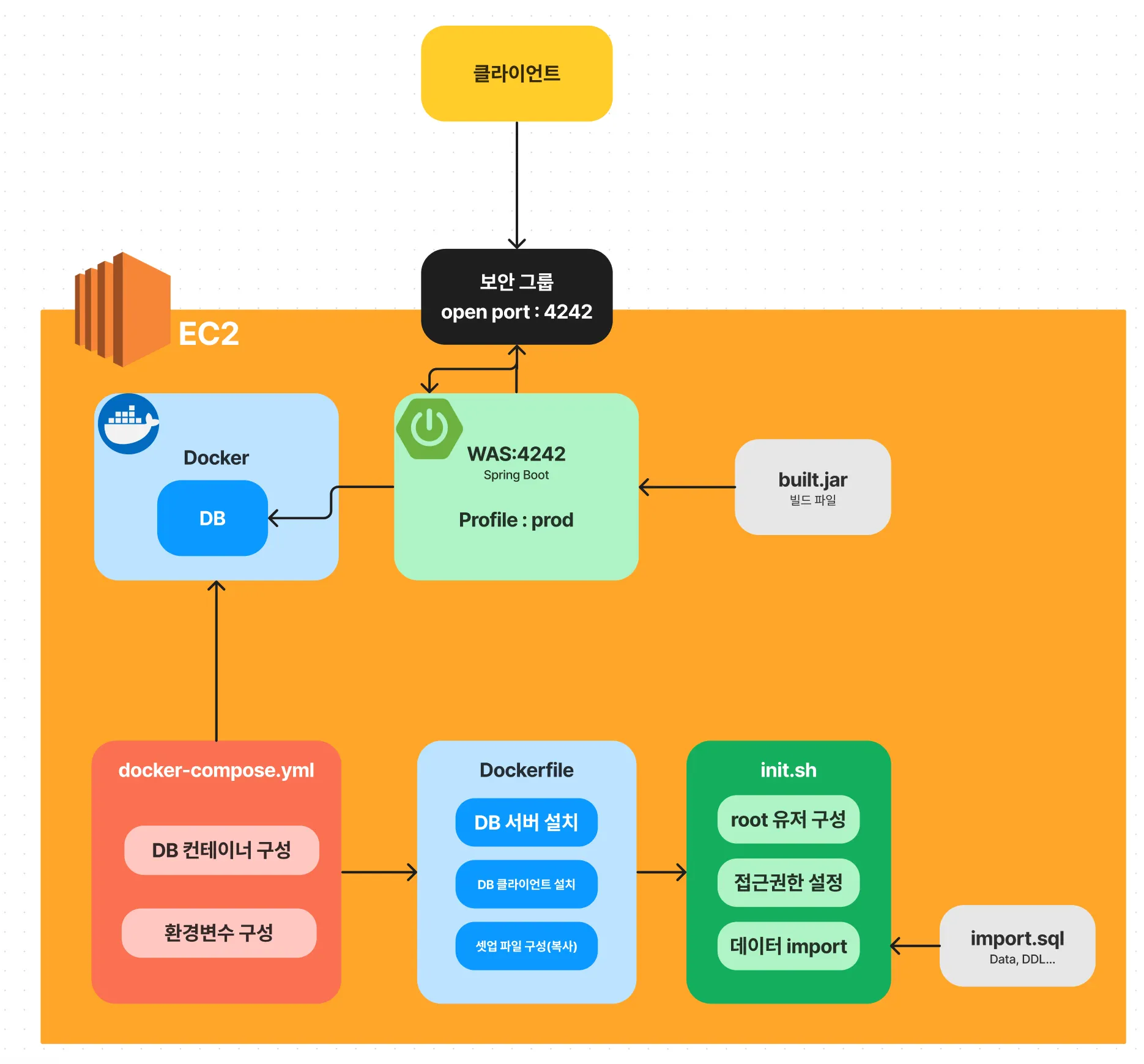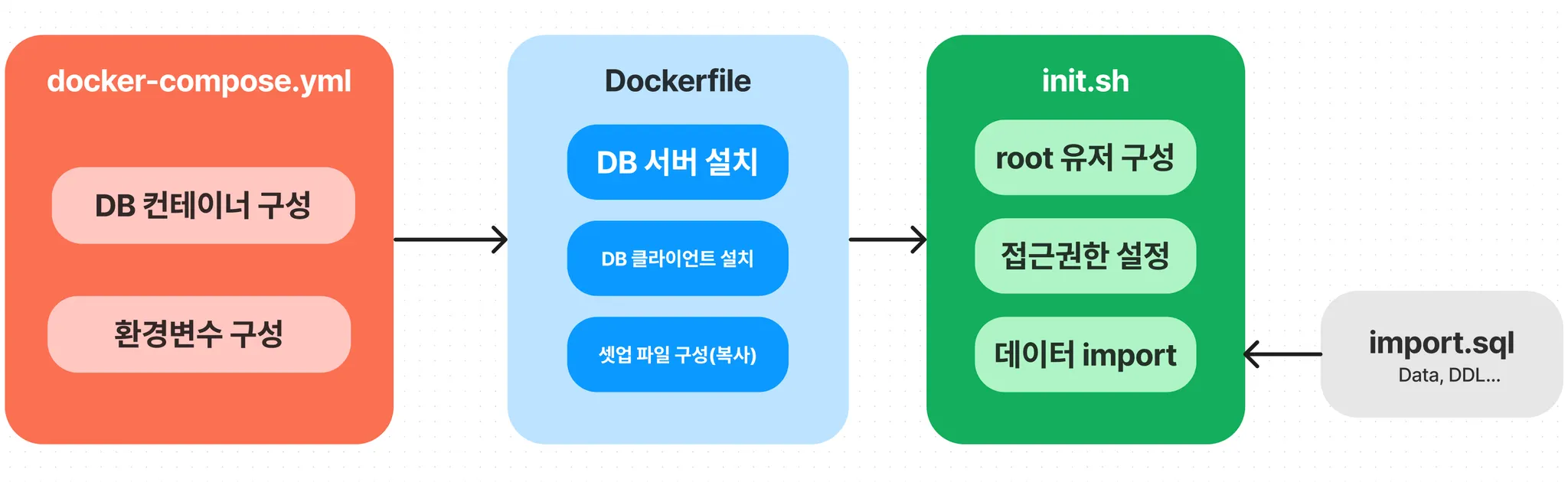 작업경로/에서 docker compose up을 실행하면, 위와 같은 프로세스를 거쳐 docker에 DB 서버를 구성할 수 있다.