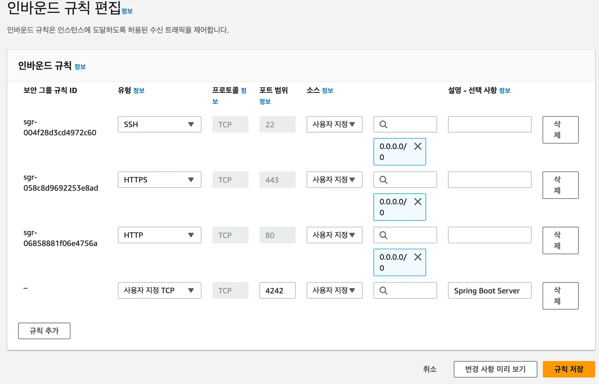 보안 그룹으로 이동해서 인바운드 규칙 편집에 들어가고, 구동하고자 하는 서버의 포트번호를 규칙에 추가해주자.