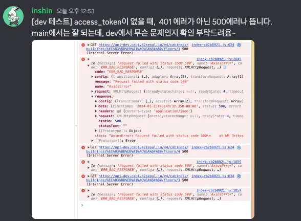 cabi 로그인 후 개발자 콘솔 → Application → Cookies → CABI_URL →access token 삭제한 후 요청을 보낸다.