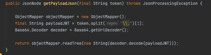 여기서 JWT 의 형태는 3개의 점으로 구분되어있고, email 을 찾기위해 . 으로 구분된 jwt 토큰값 중 2번째(payload)를 가져온다.