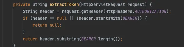 extractToken(request): Authorization 헤더 중 Bearer 토큰을 꺼내온다.