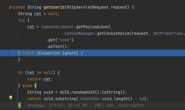 로그를 찍을때 유저가 있다면 유저에 대한 닉네임을, 없다면 UUID 를 찍어 반환하도록 만든 메소드로 확인되었다.