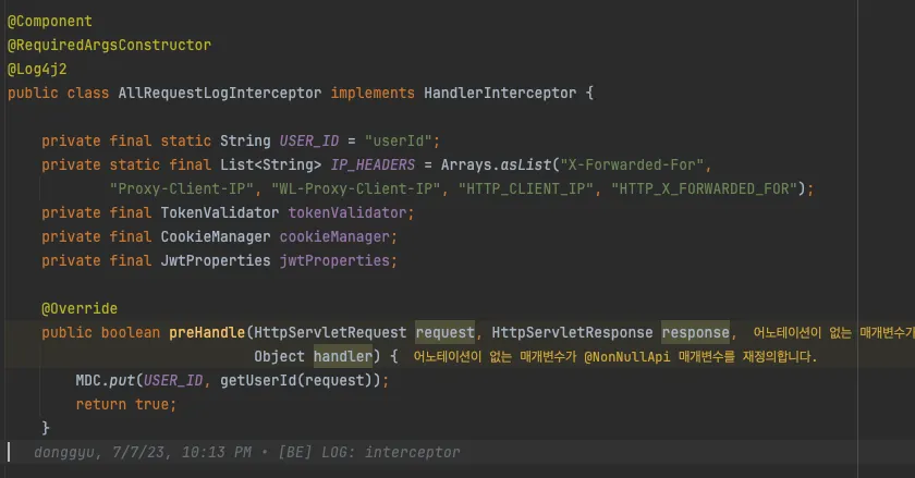 어노테이션이 명시되어있는, 메소드에 들어가기전 에 아래 AuthToken 로직을 먼저 타게된다.