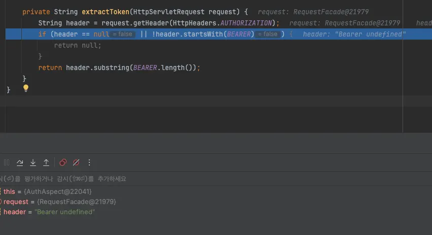 Header 에서 Bearer 를 가져오는데, 토큰이 없을경우 null 을 반환한다.