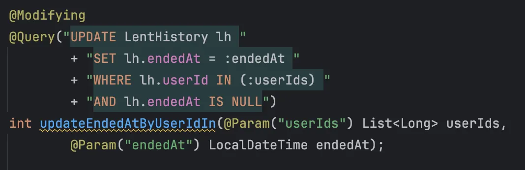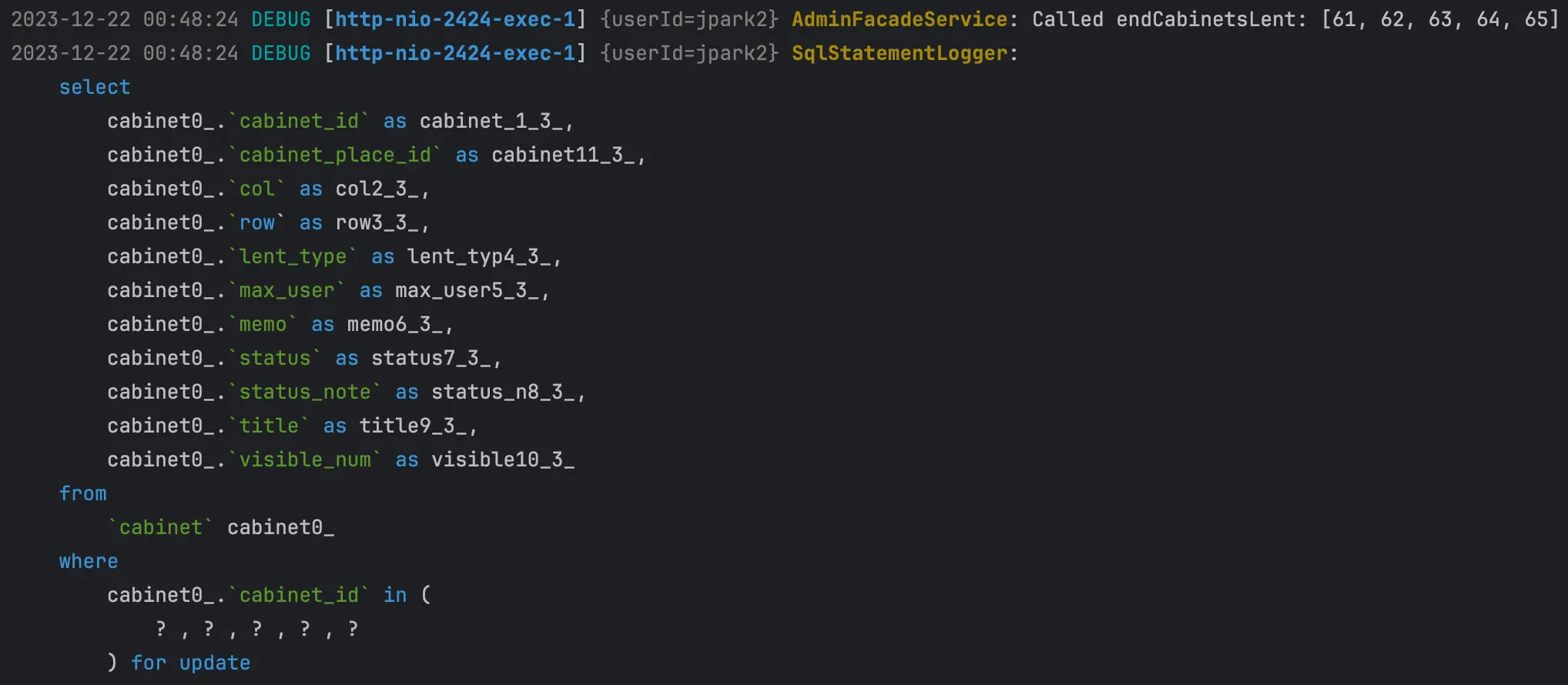 일단 코드 자체에서 List로 여러 cabinetId들로 Cabinet들을 조회한 이후, 조회한 Cabinet들을 순회하며 LentHistory를 가져와 각각의 Cabinet을 반납 및 상태 변경한다. 일단 코드의 로직 자체에서 N + 1로 쿼리 발생하는 구조로 작성되어 있다.