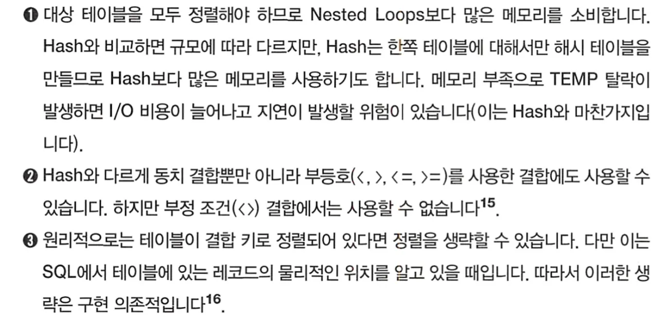 → NESTED LOOPS가 비효율적일 때 차선책, 동시 처리가 적은 작업(batch)의 경우에 많이 사용된다.
