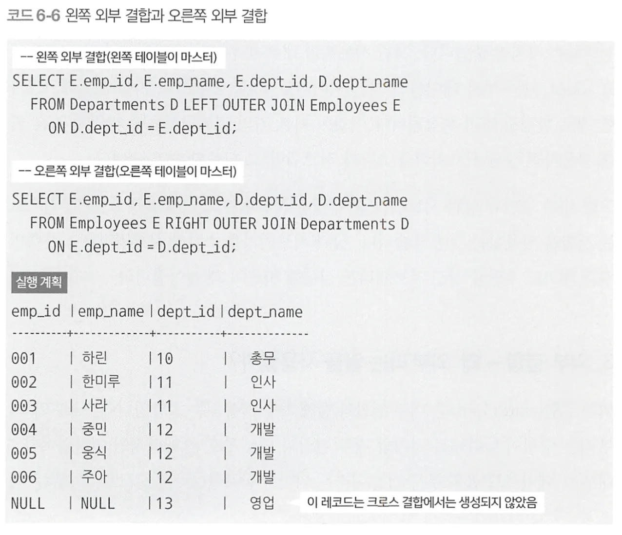 OUTER JOIN의 경우에는 마스터 테이블에만 존재하는 키가 있을 때에는 제거하지 않고 결과에 나타낸다(위의 NULL).